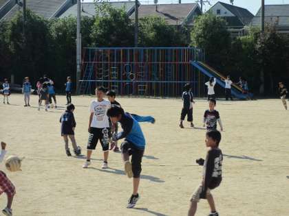 ぽかぽかと小春日和の昼休み,1年生と6年生がなかよく,サッカーをしていました。