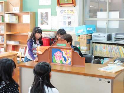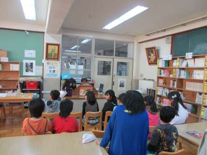昼休みに図書室で本の読み聞かせを行いました。図書館運営支援員の安居先生が「おやゆび姫」のお話を読み聞かせしました。