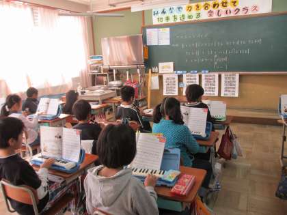 4年2組は,5時間目に音楽をしました。アラホーンパイプの合奏練習をしました。