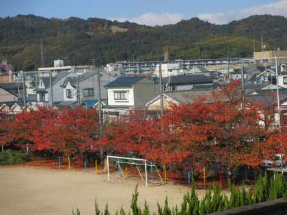 4年1組は,2時間目に体育をしました。紅葉の美しい中,球技をしました。