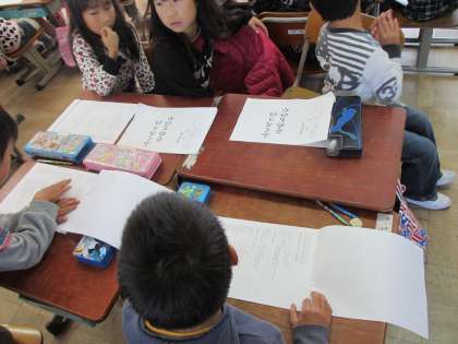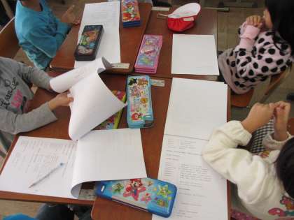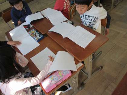 1年生は,学習発表会の脚本を読んでいました。「ふくろうのそめものやさん」という劇です。