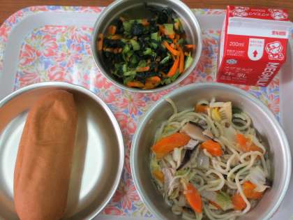 今日の給食の献立は,「小型コッペパン・牛乳・五目ラーメン・小松菜のごま油いため」です。五目ラーメンは,豚肉・にんじん・はくさい・干ししいたけ・白ネギ・しょうが・竹の子が入っている具だくさんのラーメンで,一年に一回ぐらいしか出てきません。