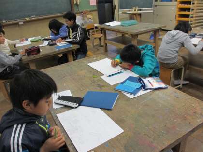 先週は,校内研究のために部活はお休みでした。11月6日は,「かなえたい夢」を考え,アイデアスケッチを描きました。今日は,画用紙に線描しました。線描ができた人から,彩色をしていくので,来週は絵の具が必要です。