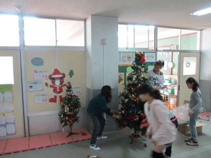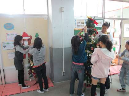 今日,保健室の前のクリスマスツリーを,保健委員会で飾り付けしました。