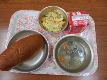 今日の給食は,「黒糖コッペパン・牛乳・変わりいり卵・ポトフ」でした。ポトフは熱くて,体が温まりました。変わりいり卵は,卵だけでなく,ベーコン・じゃがいも・たまねぎ・にんじん・パセリも入っています。