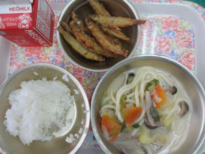 今日の給食は,「減量ごはん・牛乳・わかさぎのこはくあげ・豆乳鍋」でした。豆乳鍋には,豚肉・にんじん・はくさい・青ネギ・しめじの他にうどんが入っているので,ご飯は減量になっています。