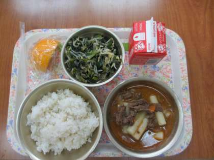 今日の給食献立は「麦ごはん・牛乳・トッポギ・ほうれん草ともやしのいためナムル・はっさく」です。トッポギは新しいメニューです。トッポギと一緒に牛肉・玉ねぎ・にんじん・白ネギが入っています。