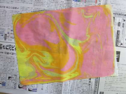 マーブリングは、そのまま液を落とすと色が沈んでしまい紙に色がのりません。水面で色を拡散させる為には、小さい紙の上に一滴ずつ液を落とします。