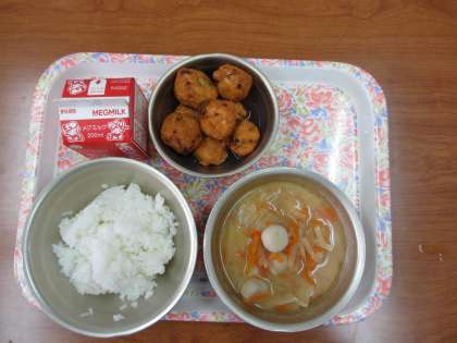 今日の給食献立は「ごはん・牛乳・がんもどきのあんかけ・豚汁」です。がんもどきは,鶏ひき肉・とうふ・おから・にんじん・枝豆・干しシイタケを使い,一個ずつ手作りして,油で揚げたものです。