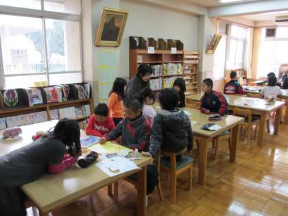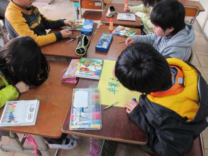 今日の2時間目は,フレンドリー活動がありました。1年生から5年生が集まり,6年生にメッセージを書きました。6年生を送る会の時に,プレゼントする予定です。