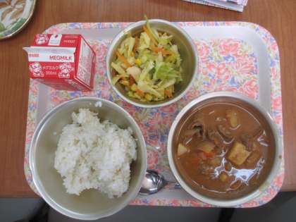 今日の給食献立は、「麦ごはん・牛乳・カレー・野菜のソティ」です。カレーは,作っている時から,ずっと良い香りがしていました。