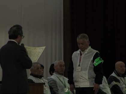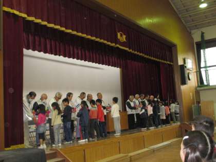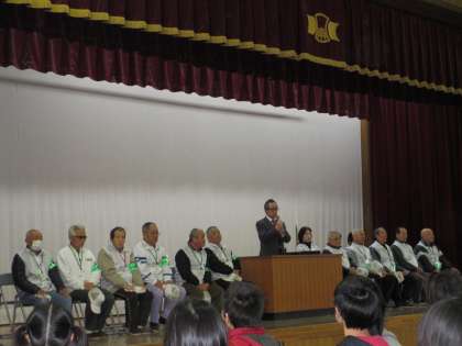 8時50分から,見守り隊感謝式を行いました。学校長から賞状を渡し,二年生が花を手渡しました。