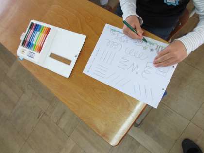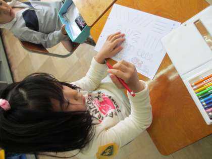 えんぴつの持ち方に気を付けて,線のおけいこをしました。できたら,クーピーで色を塗りました。