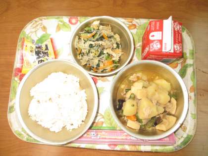 今日の給食は,「麦ごはん・牛乳・豚肉と野菜の煮つけ・もやしの煮びたし・黒大豆」でした。もやしの煮びたしは,もやしだけでなく,油揚げ・にんじん・小松菜が入っています。