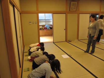 ふれあいサロンでおじぎの仕方や歩き方など基本的な作法の練習をしました。