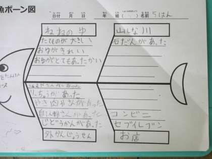 町探検で発見したことを,お魚ボーン図にまとめました。お魚ボーン図は,視点や立場を変えてみる時に役立ちます。