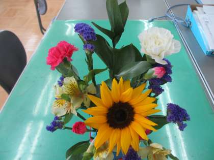 6年生の花育で,こんなふうに素敵なフラワーアレンジメントが出来上がりました。