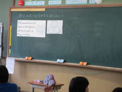 6年2組は,算数「みんなで話し合おう」の学習で,図を基にして,周りのひもの長さについて説明したり話し合ったりしました。