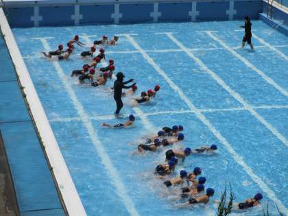 二人組を組んで活動します。まだ浅いプールなので,ワニさん歩きができます。