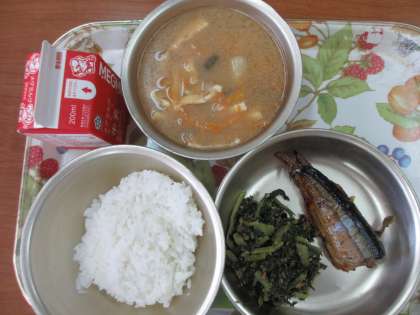 今日の給食は、「ごはん・牛乳・さんまのしょうが煮・だいこん葉のごまいため・いものこ汁」でした。いものこ汁は,里芋・玉ねぎ・にんじん・油揚げ・わけぎが入っています。