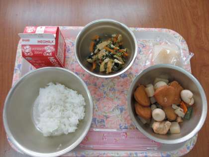 今日の給食は,「ごはん・牛乳・平天とこんにゃくの煮つけ・小松菜の煮びたし・梨」でした。平天とこんにゃくの煮つけは,平天とこんにゃくの他に鶏肉・うずら卵・にんじん・三度豆が入っています。