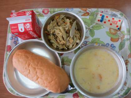 今日の給食は,「コッペパン・牛乳・ツナごぼうサンド・パンプキンチャウダー」です。ツナごぼうサンドは,まぐろフレーク・ごぼう・玉ねぎ・にんじんを酢・さとう・しょうゆ・カレー粉で味付けし,マヨネーズもまぜて食べます。