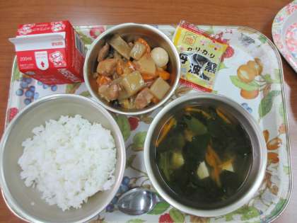 今日の給食は,「ごはん・牛乳・プリプリ中華いため・とうふと青菜のスープ・黒大豆」でした。プリプリ中華いためは,子ども達の好きな献立です。
