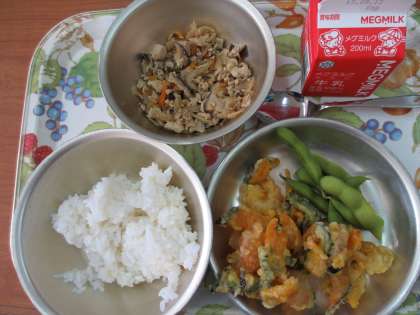 今日の給食は「とりめし・牛乳・夏野菜のかきあげ・枝豆」です。