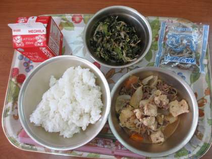 今日の給食は,「ごはん・牛乳・肉どうふ・ほうれん草ともやしのごま煮・じゃこ」です。今日は,和風の献立でした。