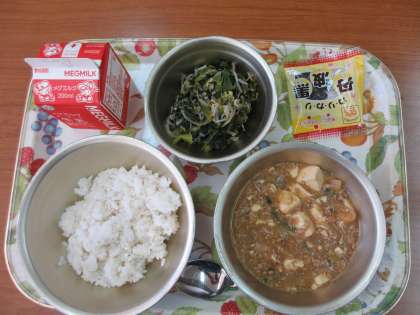 今日の給食は,「麦ごはん・牛乳・マーボどうふ・ほうれん草ともやしのいためナムル・黒大豆」です。黒大豆には,「やわらか黒大豆」と「カリカリ黒大豆」があります。