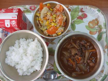 今日の給食は,「ごはん・牛乳・ハッシュドビーフ・さっぱりツナポテト」です。さっぱりツナポテトは,じゃがいも・にんじん・まぐろフレーク・コーンが入っていて,オリーブオイルやりんご酢で味付けしてあってさっぱりしています。