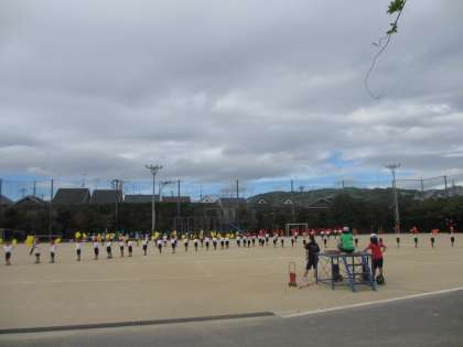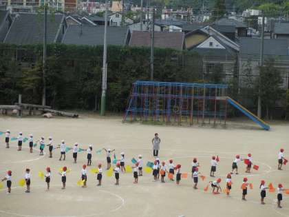 1・2年生は,1・2時間目に体育をしました。今日は,旗を持って団体演技の練習をしました。