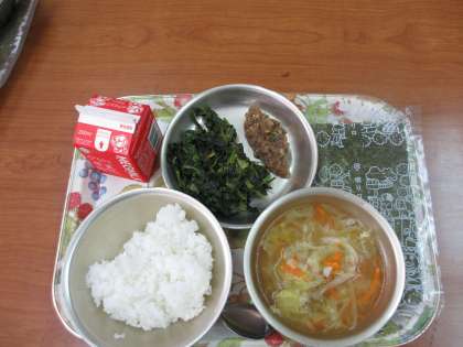 今日の給食は,「ごはん・牛乳・肉みそ納豆・ほうれん草のおかか煮・キャベツの吉野汁」です。手巻き海苔にご飯と肉みそ納豆をのせて巻いて食べます。