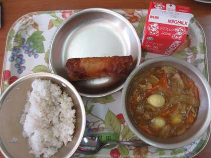 今日の給食は「カレーあんかけごはん・牛乳・春巻」です。カレーあんかけは,ご飯にかけて食べます。味つけしたまぐろフレーク・チーズ・たけのこ・はるさめを春巻の皮に一つずつ包んで揚げてある春巻は,手間がかかっていて大変美味しい献立です。