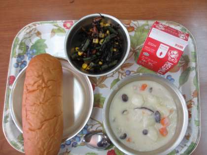 今日の給食は,「味つけコッペパン・牛乳・きのこのクリームシチュー・ひじきのソテー」です。急に寒くなり,シチューやスープが美味しい季節となりました。きのこのクリームシチューは,鶏肉・じゃがいも・たまねぎ・にんじん・しめじ・しいたけと具だくさんな上,体も温まります。