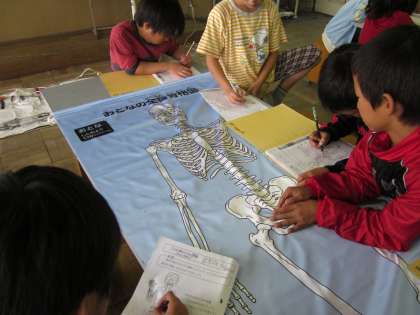20cmくらいの骨格模型や等身大の骨格がプリントされた資料から,どんな骨があるのか,どんな働きをするのかを考えました。