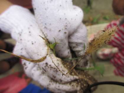 1年生は,3時間目からイモ掘りをしました。2年生と同じく体育館横の畑で育てていました。バッタやテントウ虫も見つけました。
