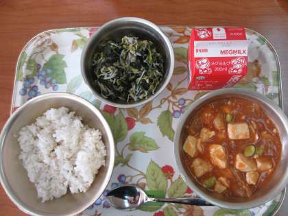 今日の給食は,「ごはん・牛乳・えびととうふのケチャップ煮・ほうれん草ともやしのいためナムル」です。えびととうふのケチャップ煮は,玉ねぎ・干ししいたけ・枝豆も入っています。