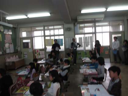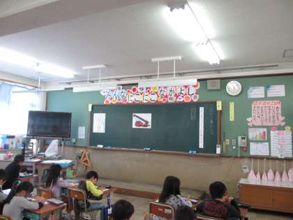 今日の5時間目に,1年2組の国語の学習をたくさんの先生に見てもらいました。