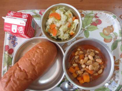 今日の給食は,「ミルクコッペパン・牛乳・ポークビーンズ・カリフラワーのホットマリネ」です。ポークビーンズは,チリコンカーンや大豆のトマト煮のように豆が入った献立です。