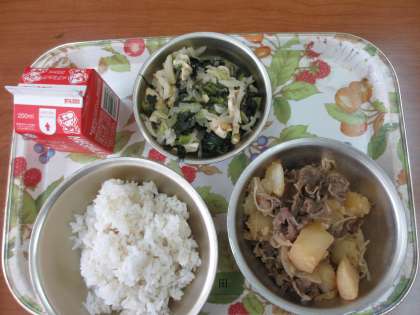 今日の給食は,「麦ごはん・牛乳・肉じゃが・切干大根の煮つけ」です。切干大根の煮つけは,出汁が効いていてとても美味しいです。