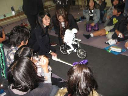 村田製作所から、池田東小学校(6年生)にムラタセイコちゃんとムラタセイサク君がやってきました。どちらもコンピューター制御で、セイコちゃんは一輪車が得意です。セイサク君は自転車です。二人とも手放し静止ができます。その最先端の科学技術を分かり易く人間のバランスの取り方から説明して頂きました。カメラの目で曲がりくねった道も自分で自転車に乗って進むこともできます。コントローラーの棒を前後左右に動かすと自転車に乗ったセイサク君も連動して前後左右に動きます。ロボットや科学のすごさがぐーんと身近に感じられ興味を持つことができました。未来の工学博士がここから誕生するかもしれませんね!