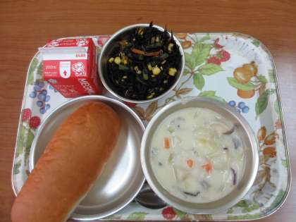 今日の給食は,「ミルクコッペパン・牛乳・きのこのクリームシチュー・ひじきのソテー」です。ひじきのソテーは,ひじきだけでなく「にんじん・コーン・三度豆」も入っていて彩りもきれいです。