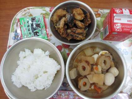 今日の給食は,「ごはん・牛乳・さんまのかばやき風・関東煮・黒大豆」です。さんまのかばやき風は,さんまの切り身をしょうが・うすくちしょうゆで味付けをしてあり,食べやすく美味しい献立です。