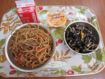 今日の給食は,「ソース焼きそば・牛乳・ひじきのいためもの・プリン」でした。