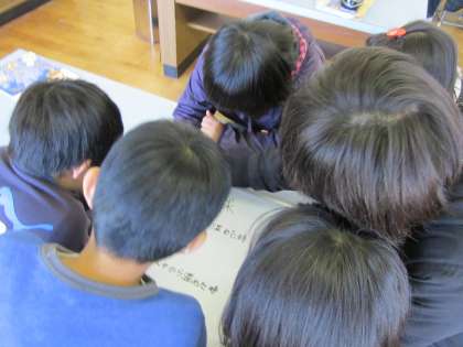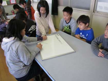 金属の棒や板に蝋を塗り,端や真ん中から火を当てて,どのように溶けるかを学びました。他班に報告するためにホワイトボードを活用し実験結果をまとめています。
