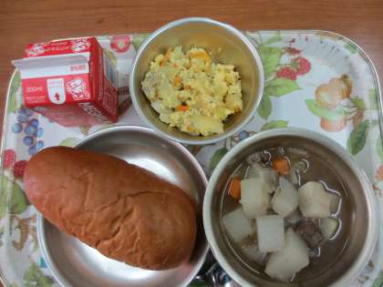 今日の給食は,「黒糖コッペパン・牛乳・変わりいり卵・ポトフ」です。ポトフは体が温まり,寒い冬にぴったりです。