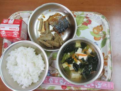 今日の給食は,「ごはん・牛乳・さばのかわり煮・たたきごぼう・すまし汁」でした。さばは,しょうが・三温糖・赤みそ・トウバンジャン・こいくちしょうゆ・米酢で煮ています。