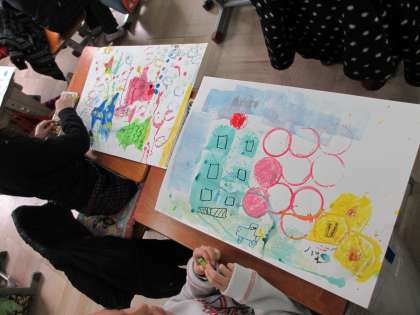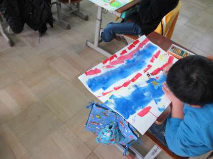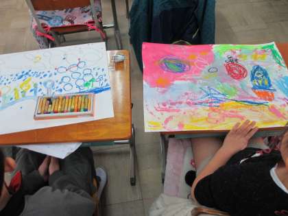 1年2組は,3時間目に図工の学習をしました。「いろいろペッタン」の絵を描きました。