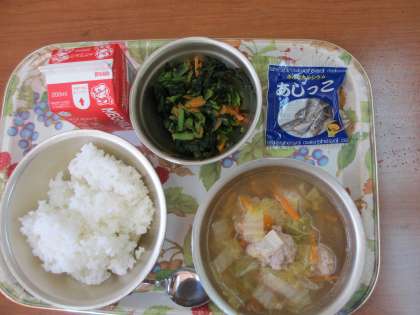 今日の給食は「ごはん・牛乳・肉団子のスープ煮・小松菜のオイスターソースいため・じゃこ」です。小松菜のオイスターソース煮は,にんじんも入っていてしっかりした食感です。